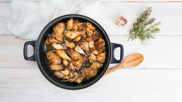 - Fríe el pollo hasta que esté dorado y jugoso.